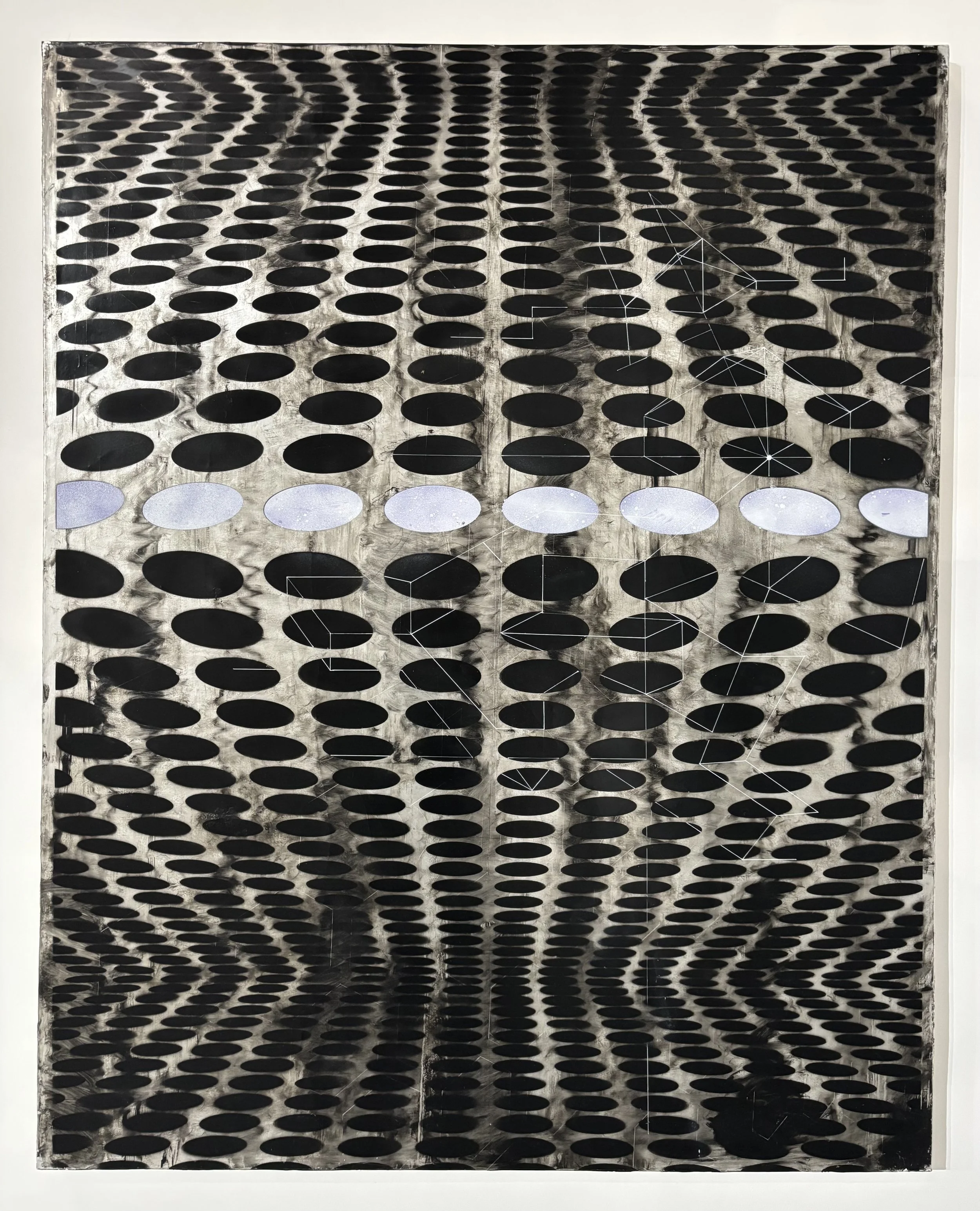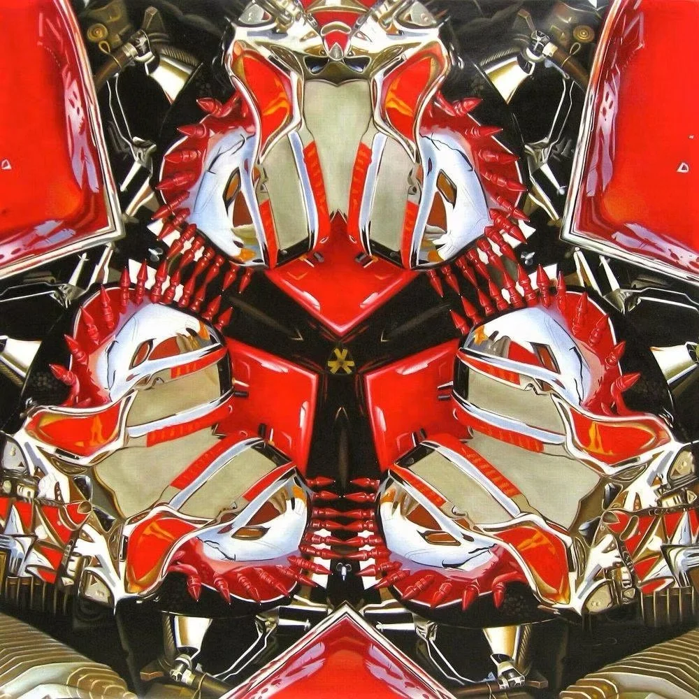 His use of black pigment is particularly revelatory, not because it rejects painterly convention, which often avoids black for fear of flattening, but because it embraces the color as architecture itself, a mass-generating force that organizes and animates the canvas, as seen in Red Chopper (2013) and Post Pythagoras Break Down (2024).