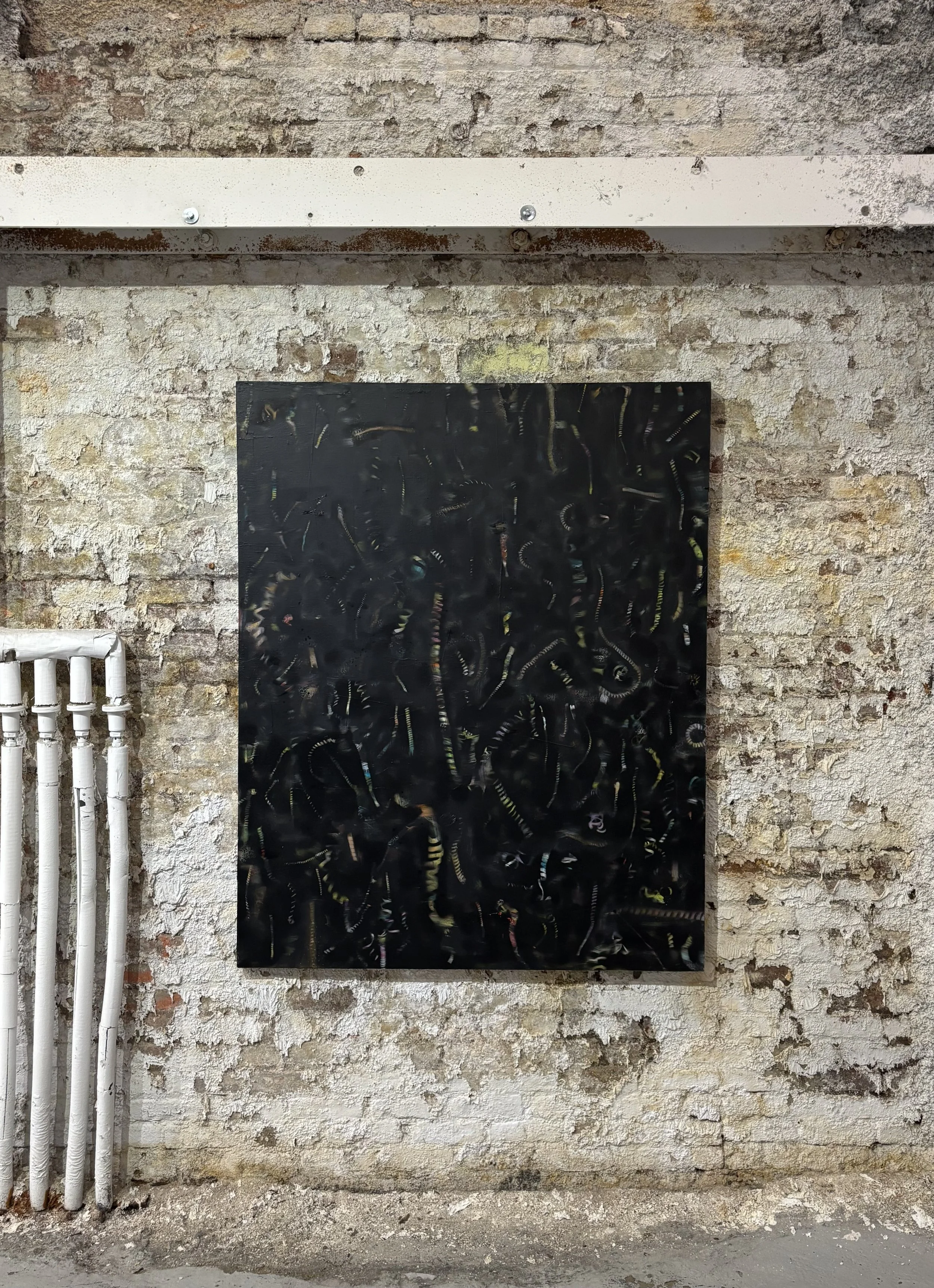 The music of Sun Ra, jazz, and lyric poets was a major inspiration to Miller and all the other artists included in this small survey of Afrofuturism. And music is what brings the canvases to life in their flat form. I thought of this as I wandered the lower floor, a truly massive space with old crumbling brick walls hidden behind the plywood slabs supporting each artwork: a woman on the upper floor was sweeping, and in the quiet of a rainy Thursday afternoon, the rhythmic sweep created a soundtrack for my looking, as surely rhythm guided Miller's brushes.